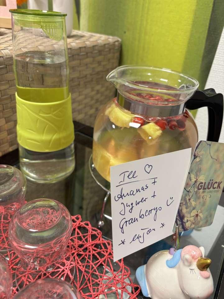 Die hotte Ingwerknolle stand dabei im Mittelpunkt, aber auch die kesse Orange, die juice Ananas, der sanfte Lavendel und die spicy Nelke wanderten in unsere große Teekanne. Meine kreativen Wunderwasser haben euch sehr gut gefallen und ihr wolltet gerne die Rezepte haben … Bitteschön Hier 🙂 die Dosierung ist Geschmacksache, Kräuter und Gewürze eher vorsichtig, frische Inhalte können großzügig verwendet werden.