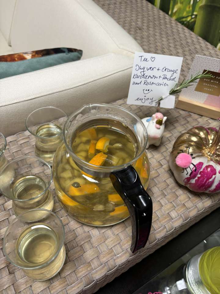 HariGLOW der Tee der deine innere Mitte leuchten lässt, frischer Ingwer, frische Orange, getrocknet grüner Kardamom und Fenchel (leicht gemörsert) und 1 Zweig frischer Rosmarien; euer Favorit entspannt die Bauchorgane und Rosmarien plus Kardamom senden Good Energy in dein Gehirn … wirkt Stimmungsaufhellend