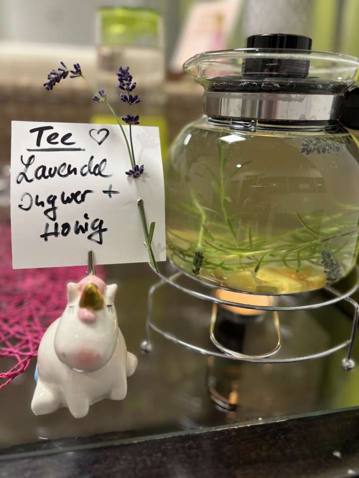 Entspannungscocktail: frischer Ingwer, getrocknete Lavendelblüten und Honig; wirkt wärmend und beruhigend, ein super Betthupferl